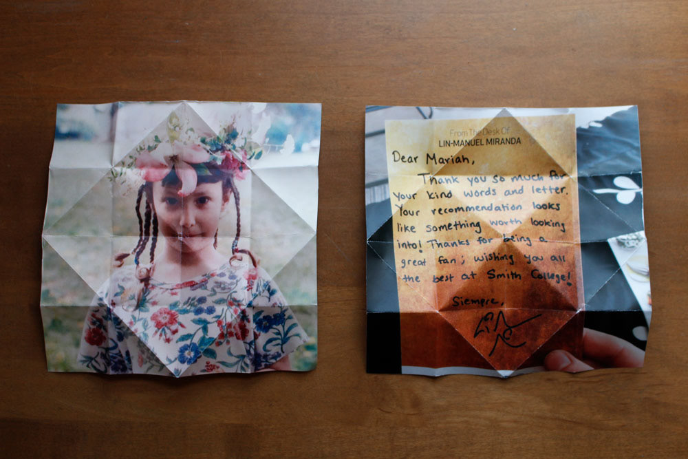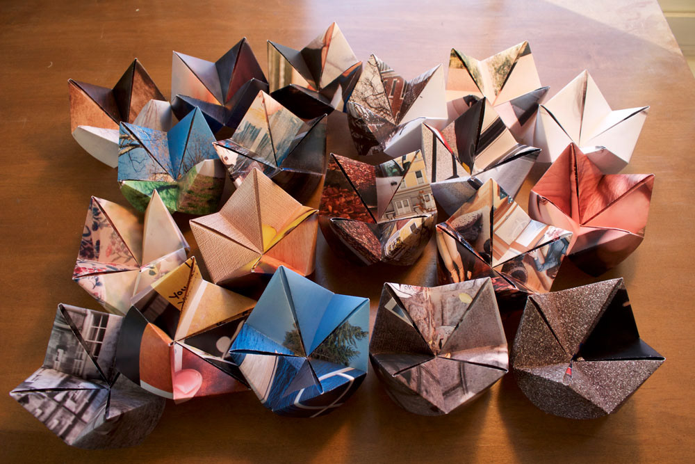 I approached this question by examining the purpose of fortunetellers. I thought about how a fortuneteller is meant to reveal an aspect of someone’s future, but also to bring people together. As a result I decided to ask a group of people to send me two photographs, one photograph that reminded them of their past and one that represented their present. I then wanted to present the folded photographs in a way where people would want to interact with them. I wanted them to unfold the fortunetellers and learn something new about photographs or people or fortunetellers they were examining.